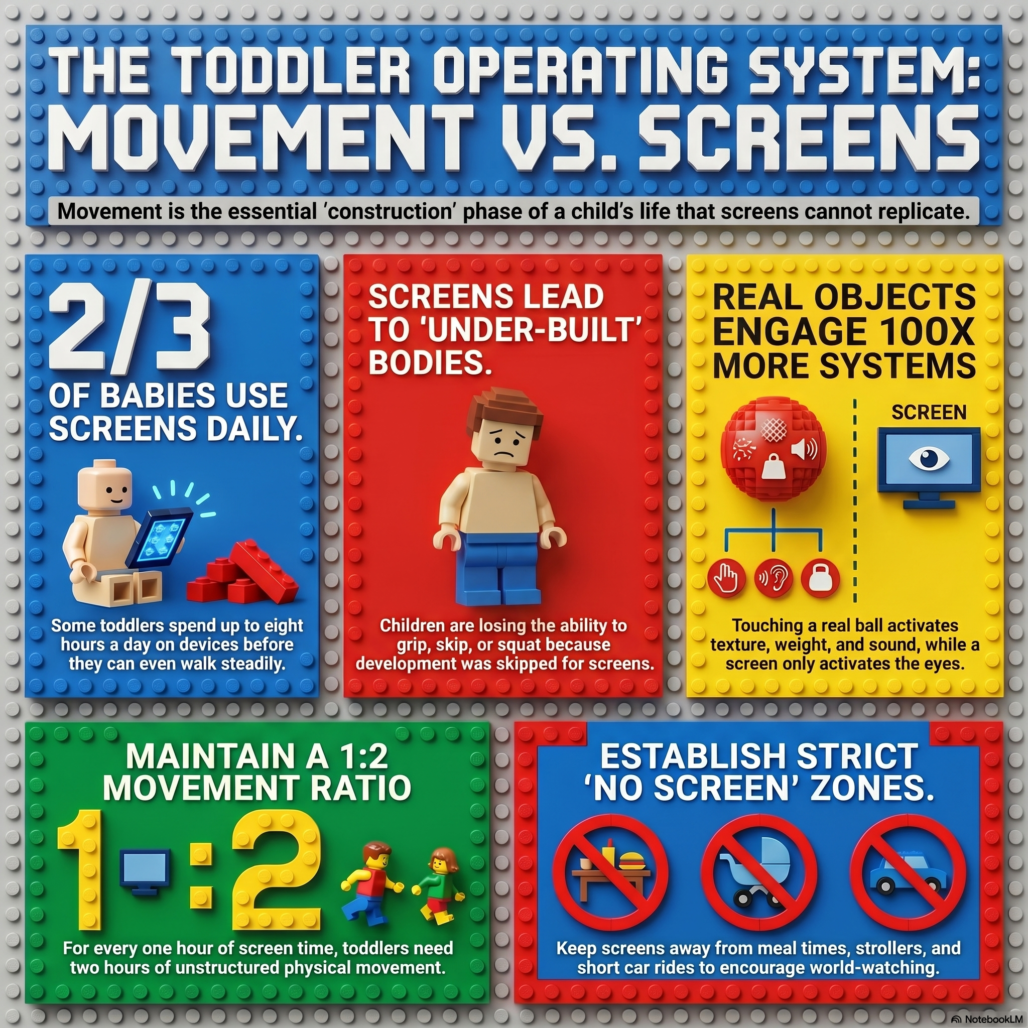When you replace movement with a screen, you don’t just lose the activity. You lose the wiring. The eyes never learn to track distance. The neck stays weak from looking down. The fingers learn to swipe before they learn to grip.